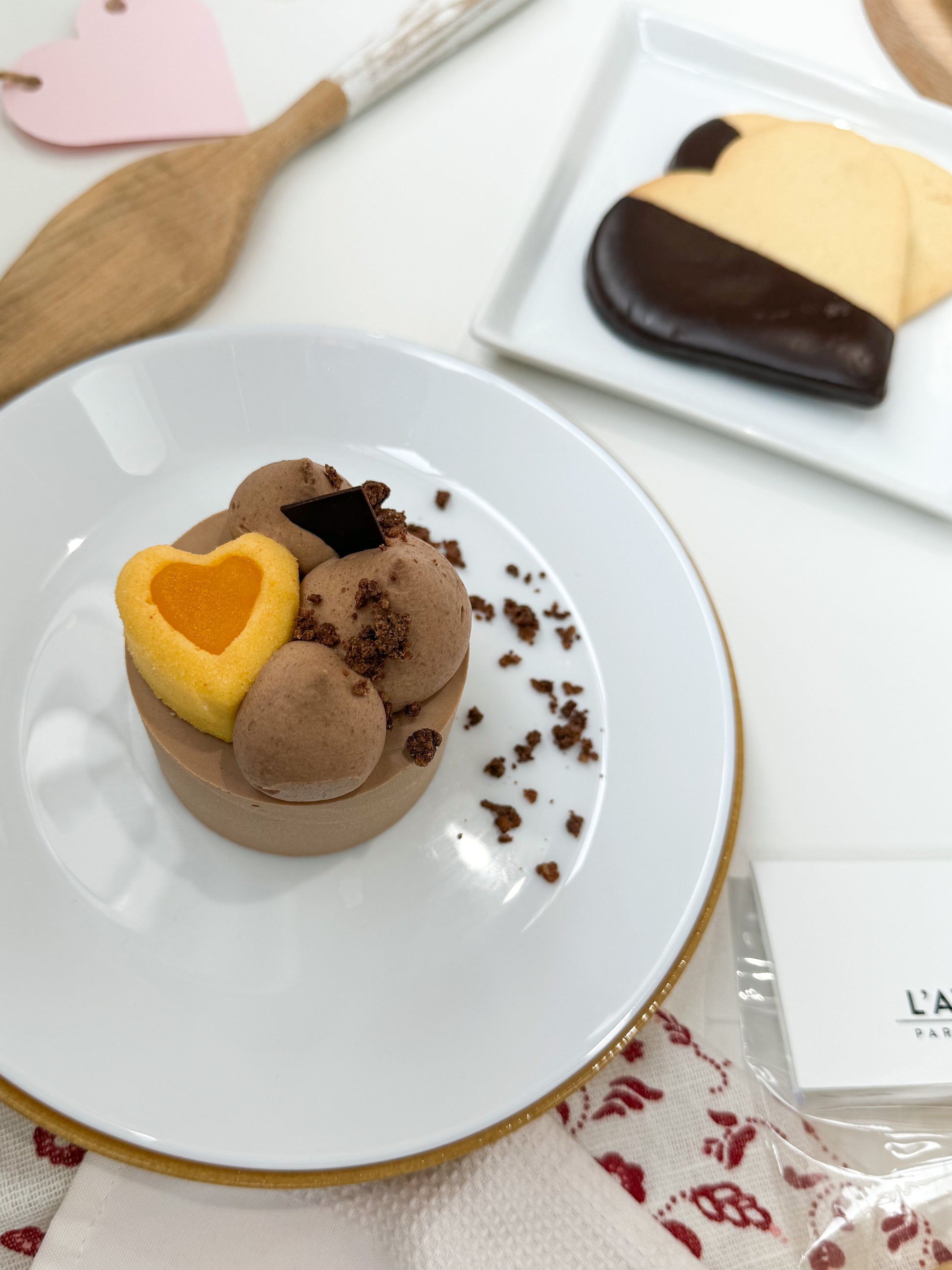 Une portion individuelle d'un gâteau Édition Spéciale St-Valentin 2026 fait d'une mousse chocolat au lait, crémeux et gel aux fruits de la passion, biscuit et croustillant cacao.